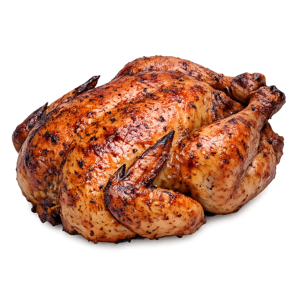 Pollo arrosto intero, dorato e succoso, cotto lentamente per un gusto intenso e una qualità che conquista al primo assaggio.
